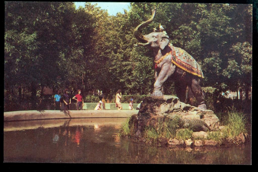 Еще через два года в парке установили скульптуры из железа и бетона. В центре пруда появился каменный постамент с бетонными крокодилами, над ними – слон в нарядной попоне и сидящим сверху мальчиком. Композиция называлась “Индийский мальчик на слоне”, её автором был Михаил Ружейников.