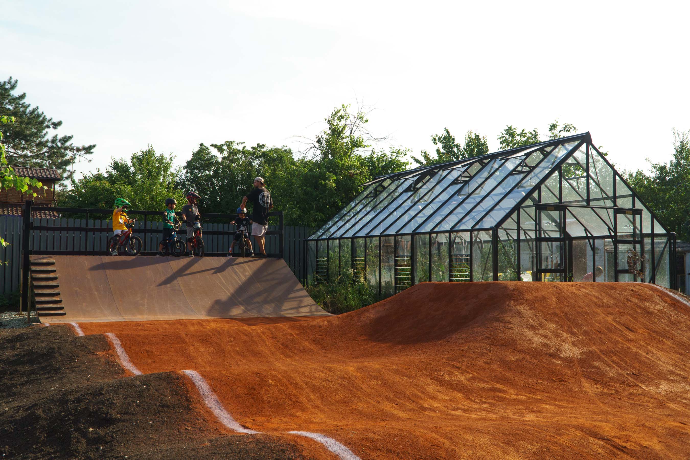 Получилась отличная локация для обучения и тренировок начинающих BMX-райдеров. Базовые навыки можно отработать на кочках пампа, а прыжки и повороты – на деревянных фигурах. Площадка полумобильная и трансформируется, подстраиваясь под прогресс райдера. Как только он научится делать первые трюки, грунтовую часть трассы можно видоизменить – сделать выше фанбокс и радиусы, а деревянные фигуры передвинуть на новые места.